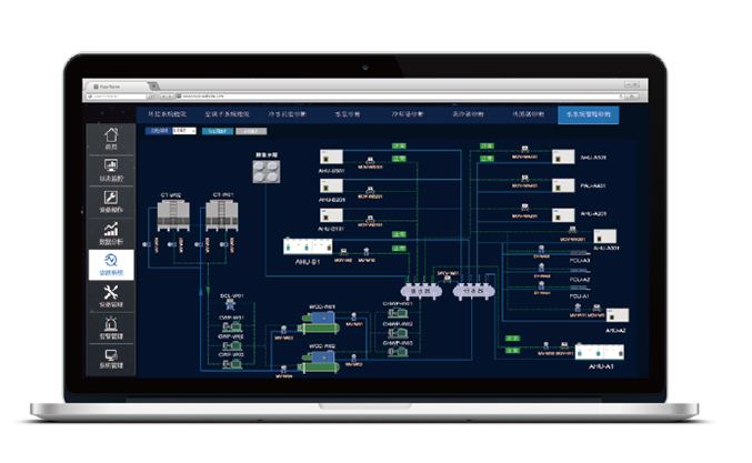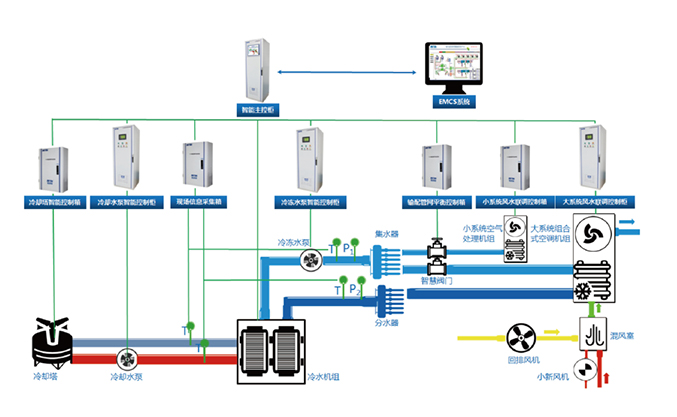 系统由智慧冷冻站、智慧输配系统和智慧控制系统构成,主要从末端用户负荷需求着手,解决输配系统水力失调问题,提高中央空调系统运行效率,降低设备运行能耗,实现系统COP最优。